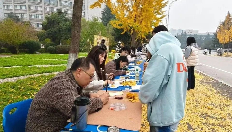 艺术学院的同学与总务部的老师俯首案前,执毛笔,蘸浓墨,在舒展的银杏叶上落笔生花。一时间,墨香与叶香交织氤氲,漫成这个秋天最清雅的气息。