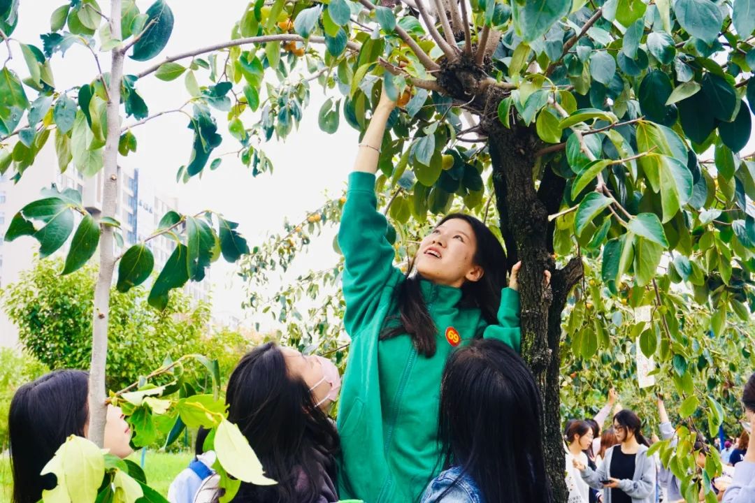 正午十二时三十分,“采摘开始”的宣告点燃了整个现场。同学们纷纷走向柿树,有人踮脚探寻高枝上最饱满的那一颗,指尖触及果皮柔软的瞬间笑意盈盈;有人俯身承接同伴递来的果实,不一会儿筐中就叠起橙红的小山;还有人举起手机,将“柿压弯枝”的秋日写进永恒。叶声簌簌,笑语与果香交织,勾勒出校园中最诗意的秋景。